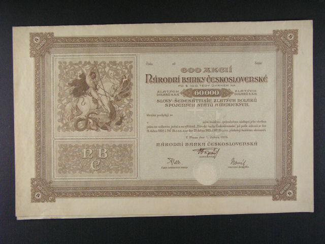 Akcie Narodni Banky Ceskoslovenske na 60.000 Zlatych dolaru S.S.A. 1.4.1926, nevypsana, velmi dekorativni, v hnede barve