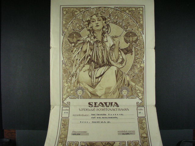 Pojistna smlouva Vzajemne pojistovaci banky Slavia z r. 1934, lito. od Muchy, dekorativni, 2x preloz.