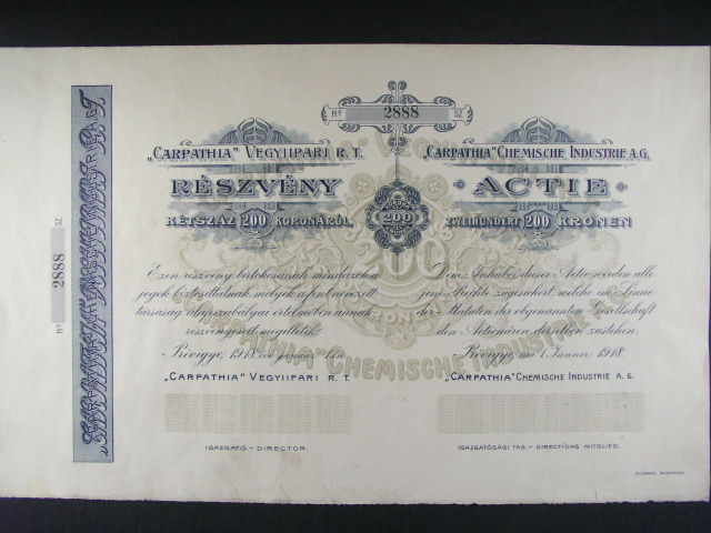 Akcie "Carpathia" Chemische Industrie A.G. 200 K 1.1.1918, Uhersko, c. 2888, dekorativni
