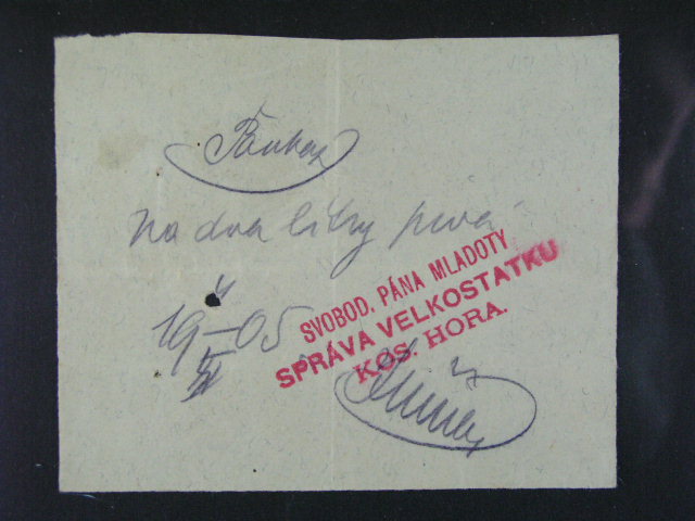poukaz na 2 litry piva 2.9.1905, rucne psany cesky, razitko 3-radkove cesky, Panstvi Kosova Hora a Cerveny Hradek - Sprava velkostatku Svob. pana Mladoty - pivovar