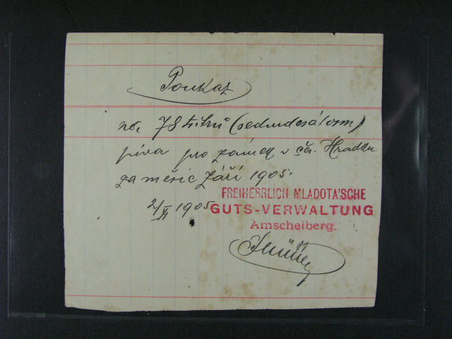 poukaz na 78 litru piva 2.11.1905, rucne psany cesky, razitko 3-radkove nemecky, Panstvi Kosova Hora a Cerveny Hradek - Sprava velkostatku Svob. pana Mladoty - pivovar