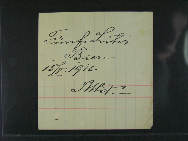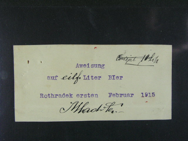 poukazka na 5 litru piva - 13.5.1915, rucne vypsana - nemecky, podpis Mladota, Panstvi Kosova Hora a Cerveny Hradek - Sprava velkostatku Svob. pana Mladoty - pivovar
