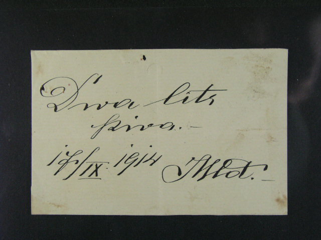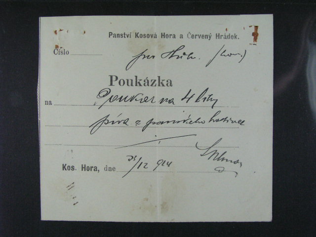 poukazka na 2 litry piva 17.11.1914, rucne vypsana - cesky, podpis Mladota, Panstvi Kosova Hora a Cerveny Hradek - Sprava velkostatku Svob. pana Mladoty - pivovar