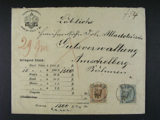 penezni dopis (15ks a100 zlatych) zaslany z Linze 10.2.1893 Svob. panem Mladotou na Spravu jeho velkostatku v Kosove Hore, neporusene pecete, vyborne zachovale