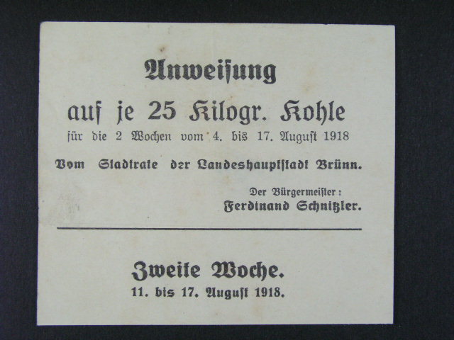 poukazka na 25 kg uhli do 17.8.1918 Mestska rada zem. hlavniho mesta Brna, purkmistr Fer. Schnitzler, text nem.