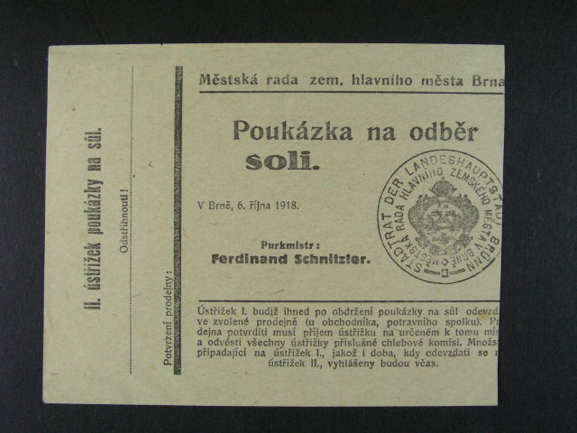 poukazka na odber soli 6.10.1918 Mestska rada zem. hlavniho mesta Brna, purkmistr Fer. Schnitzler, text cs. - nem.