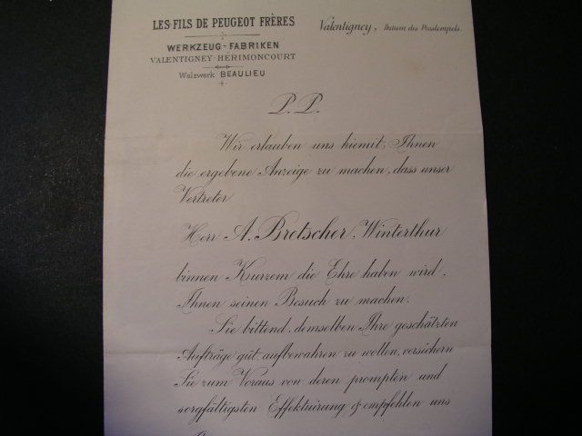 obchodní dopis fy. Peugeot zaslaný ve Švýcarsku 1895, zajímavé
