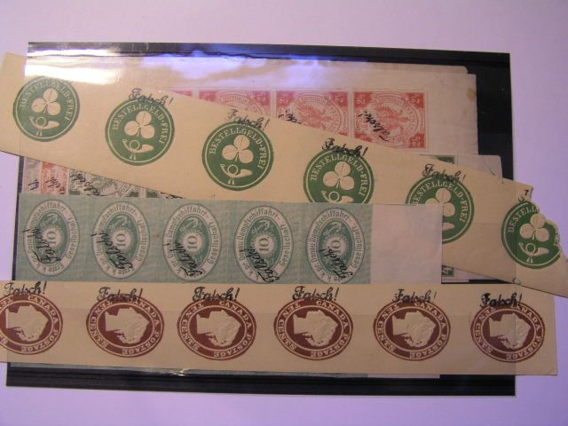 sestava falz zn. staroněm státu L?beck 1/2Sch, 2 1/2Sch v rohových 15ti-blocích, zn. 4Sch v 10ti-bloku, Kanada 10c v 6ti-pásce, Rakousko - plavba Dunajská 10ct v 10ti-bloku, zajímavý studijní materiál