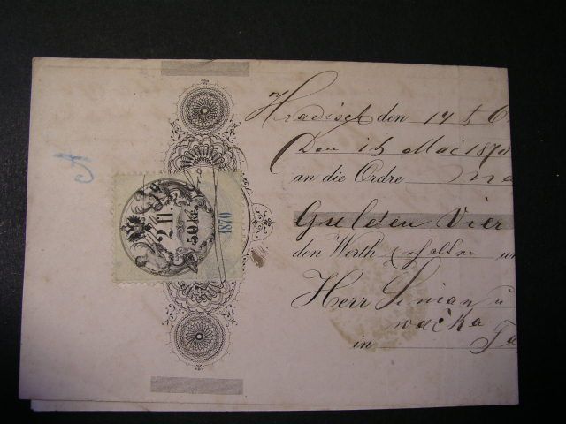 účet na 436 Guldenů z r. 1874 s kolkem 2fl.50kr, znehodnoceno perem