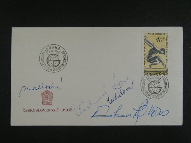 CSR - obalka s pritiskem CESKOSLOVENSKE SPOJE s raz. PRAHA 8.7.62 XV. MISTROVSTVI SVETA VE SPORTOVNI GYMNASTICE s podpisy: V. Caslavska, H. Ruzickova, Kubickova, trenerka Matlochova
