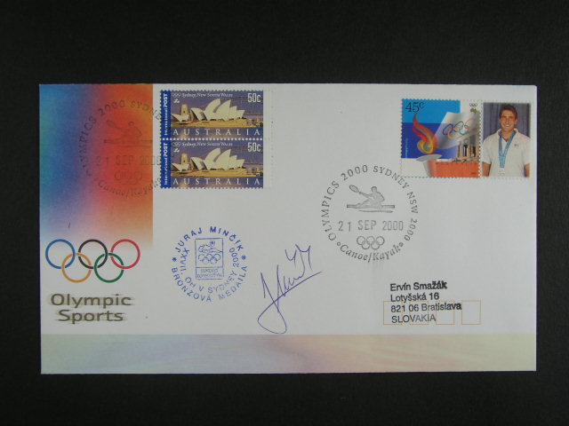 OH Sydney 2000 - Slovensko - oficielni obalka mj. se zn. 45c s kuponem s pritiskem bronz. medailisty na kajaku Juraje Mincika s vlastnorucnim podpisem