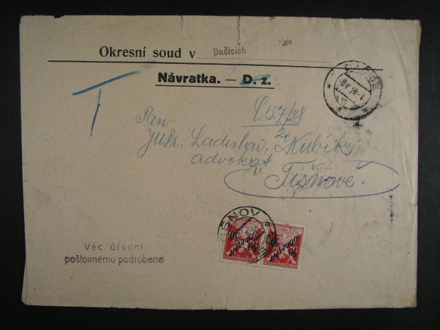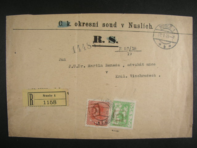 610 uredni soudni R-dopis frank. smis. frankaturou 15h Karel + c. 3 s provizornim pretiskem D v ramecku v cervenohnede barve (dopl. provizorium), pod. raz. NUSLE 31.1.19, prich. pres zn. KRALOVSKE VINOHRADY, zk. Kvasnicka, dobra kvalita, velmi zajimave 500