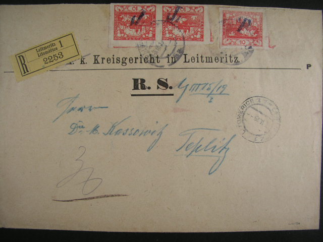 611 sestava 3 ks urednich soudnich R-dopisu frank. zn. c. 3, 5, s proviz. pretiskem T, zk. Kvasnicka 600