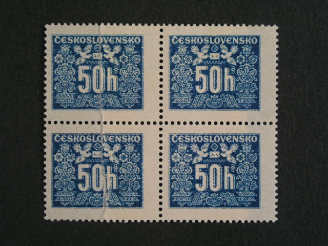 603 zn. DL c. 53 - dva ctyrbloky s DV bile ruce, carka pod A ve slove POSTA, 6ti-blok a levy spodni rohovy ctyrblok s ochr. listou a DZ 7, resp. 8 300