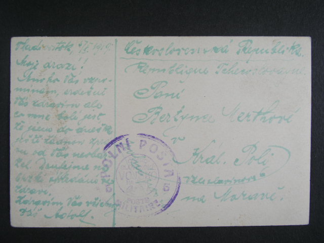 Sibir - celistvost do CSR od prislusnika cs. jednotek s utvar. raz. PP c. 5 s dataci 5.10.1919 Vladivostok