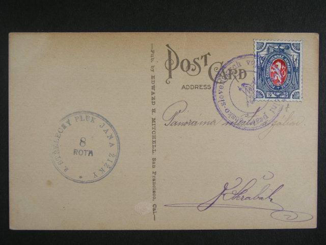 Sibir - bar. pohlednice - panorama mesta San Francisca s popisem a raz. POLNI POSTA CESKO-SLOVENSKYCH VOJSK + kulate raz. 3. STRELECKY PLUK JANA ZIZKY 8. ROTA