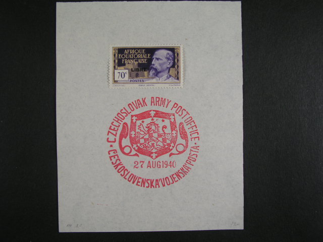 Anglie - Francie - sestava 7 ks listu papiru se zn. a raz. CZECHOSLOVAK ARMY POSTOFICE 27.AUG.40 + jedna pohlednice s raz. CZECHOSLOVAK FIELDPOST