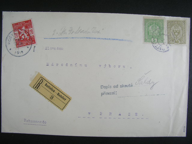 R-dopis z Batelova do Prahy na Narodni vybor, frank. zn. P 2 (Mi. 186), P 6 (Mi. 194) s raz. BATTELAU 8.12., dofrank. zn. SK c. 2 s raz. POSTA SKAUTU 7.11.1918 + raz. Dopis od skauta prevzal s podpisem, zk. Karasek