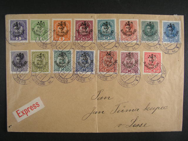 EXPRES-obalka vetsiho formatu s vylepenymi zn. RV 85 - RV 99 s raz. BUDEJOVICE 8.11.18