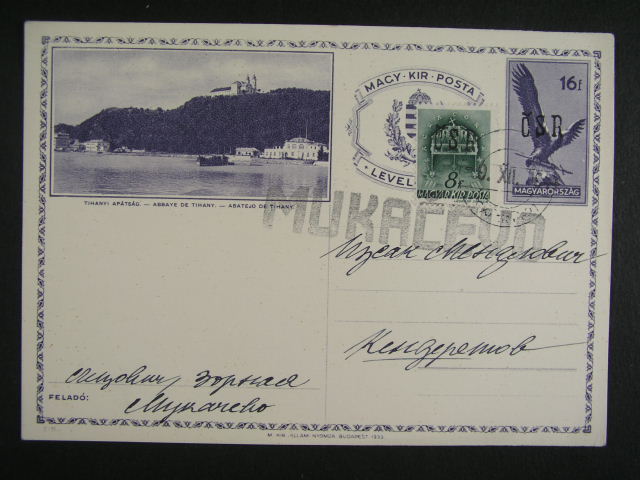 Mukacevo - madarska celina Md 6 16fil s pretiskem CSR, dofrank. zn. 8fil s pretiskem CSR se znarodnenym kulatym raz. 9.12.44 a pridavnym radkovym raz. MUKACEVO, kat. Majer 10000 Kc