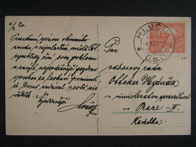 uzemni zmeny - Hlucinsko - celistvost frank. zn. c. 7 s pod. raz. HLUCIN C.S.P. 4.2.1920 z posledniho dne nemecke spravy jiz s cs. frankaturou, mimoradne vzacne, zk. Benes