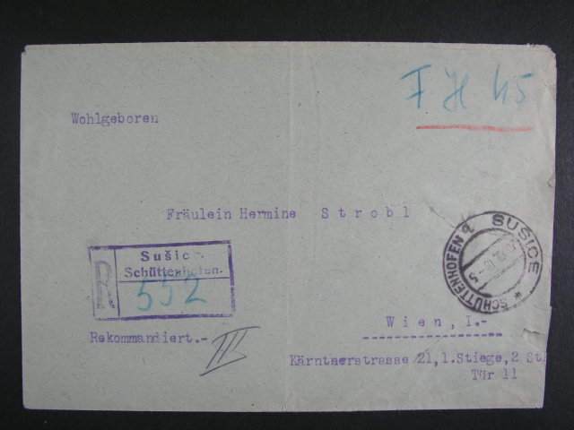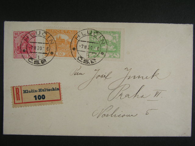 uzemni zmeny - Hlucinsko - R-dopis vyfrank. smis. frankaturou 5 + 60h Hradcany + 10pf Germania, pod. raz. HLUCIN 7.2.1920, spravna frankatura 75h jako R-dopis, vzacne, lux. kvalita