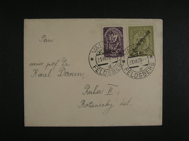 uzemni zmeny - Valticko - celistvost frank. rak. znamkami Mi. c. 237 + 268, pod. dvojjazycne raz. VALCICE/FELDSBERG 31.7.20, adresovano do Prahy, velmi vzacne, oblast Valticka byla predana CSR fakticky az dne 31.7.1920 a platnost rak. zn. skoncila 2.8.20,