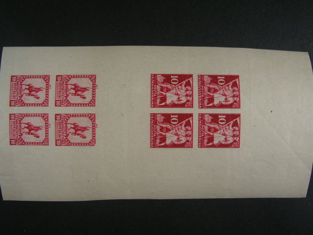 ZT neprijateho navrhu J. Zizka + Legionari tiskarny A. Hasse, ve ctyrblocich v soutisku se svislym meziarsim v barve cervene
