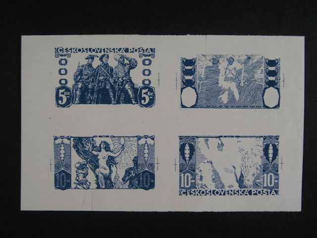 ZT neprijateho navrhu 5K a 10K Cs. legionari od Prof. Kupky, v barve modre + fazovy tisk v soutisku na kousku papiru v modre barve