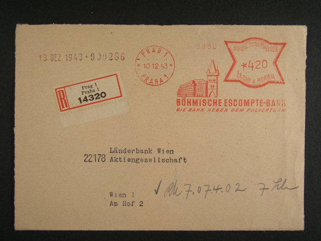 R-dopis do Vidne s frankotypem BÖHMISCHE ESCOMPTE - BANK PRAG 1 10.12.43, prich. raz., velmi zajimave