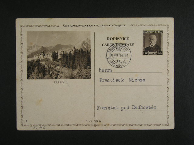 CDV 67/3 zaslana do Frenstatu s pod. raz. DUNASZERDAHELY (Dunajska Streda) 14.12.38