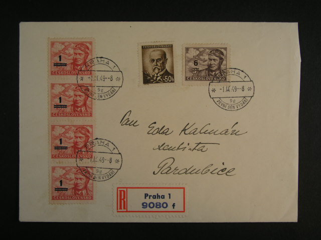 R-dopis do Pardubic frank.mj. zn. L c. 25 ve svisle ctyrpasce + L 27 s raz. PRAHA 1 1.9.49 PRVNI DEN VYDANI