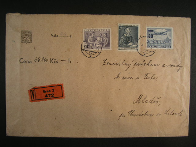 sestava 5 ks peneznich dopisu z r. 1952, vysoke zajimave frankatury, mj. zn. L 32