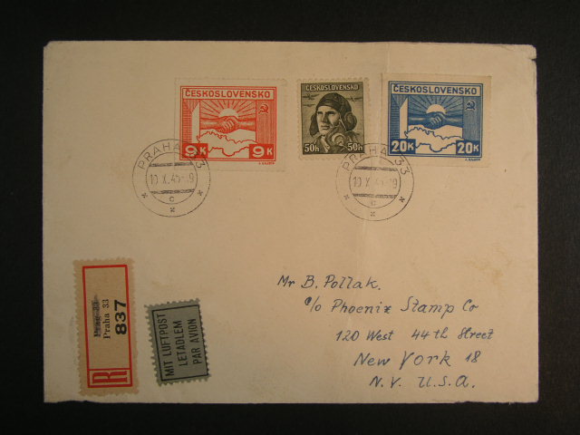 letecky R-dopis do USA frank. zn. c. 357 + 359 + 393, pod. raz. PRAHA 33 10.10.45, pruch. a prich. raz., dopis svisle mezi zn. prelozen