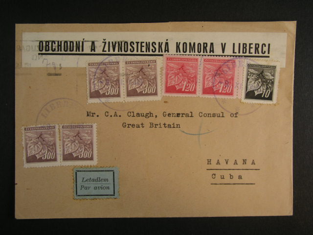 firemni let. dopis na Kubu s podacim fialovym raz. LIBEREC 9.11.45 + prich. raz.