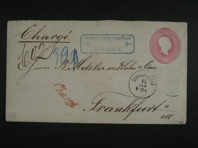 1460 Baden - firemni celinova obalka U9 s dennim raz. MANHEIM 15.JAN. + radkove cervene raz. CHARGE, dobra kvalita 200