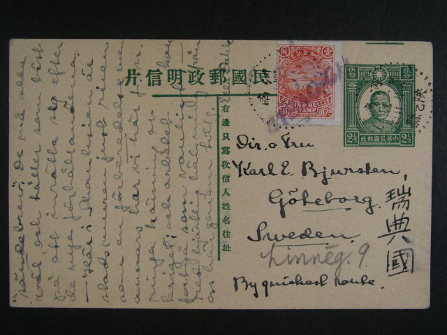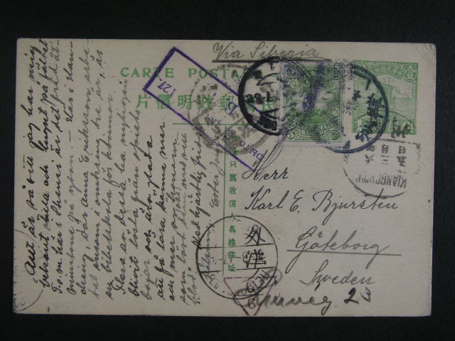 1842 Cina - KL 1c do Svedska, dofrank. dobrocinnym kolkem 5c ve prospech hladomoru, pod. raz. KIANGCHANG s dataci v textu 28.2.17, cenzurni, pruch. a prich. raz. 1300