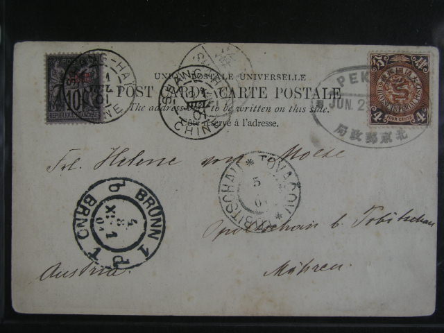 1844 Cina - celistvost na Moravu frank. smis. frankaturou 4c s ovalnym raz. PEKIN 2.JUN.1901, dofrank. franc. zn. 10c s pretiskem CHINE a kulatym raz. SHANGHAI + pruch. a prich. raz. 2500