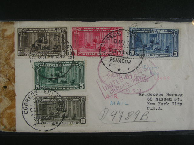 1847 Ecuador - let. dopis do USA frank. pestrou frankaturou, pod. raz. ECUADOR OCT.9.1943, cenzurni, pruch. a prich. raz. 200