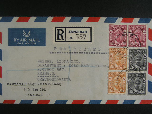 Zanzibar - letecka R - celistvost do Ceskoslovenska fr. pestrou frankaturou , pod. raz. ZANZIBAR .8.2.50