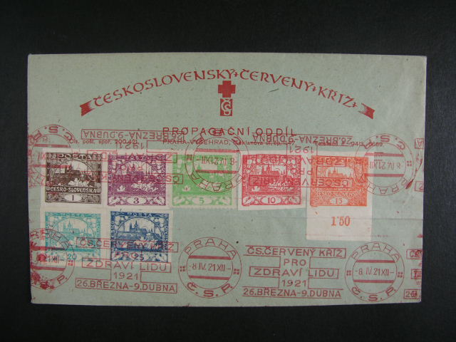 Cerveny kriz - oficielni obalka CSCK propagacni oddil s vylepenymi zn. Hradcany c. 1, 2, 3 B, 5, 7, typ I + II. typ pricky (TD I, ZP 91), 8, 10 s cervenym stroj. raz. CS. CERVENY KRIZ PRO ZDRAVI LIDU ...PRAHA 8.4.21