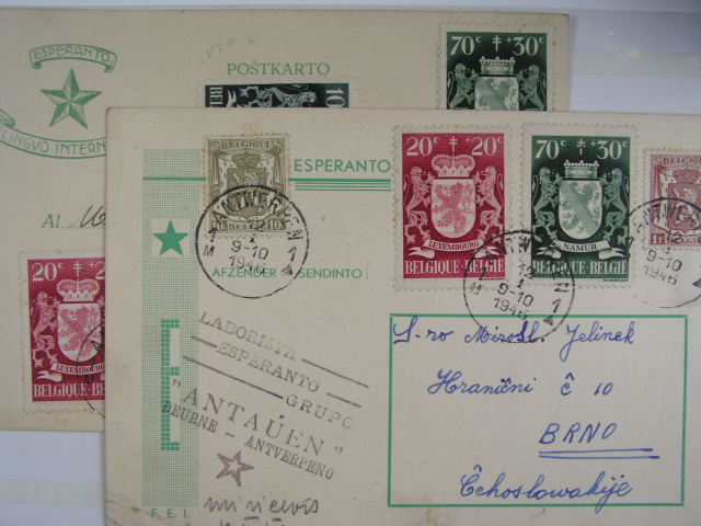 Esperanto - dva KL s pritiskem ESPERANTO frank. belgickymi zn., pod. raz. ANTWERPEN 12. resp. 13.1.1946 + radkove raz. LABORISTA ESPERANTO GRUPO "ANTAUEN" DEURNE - ANTWERPENO