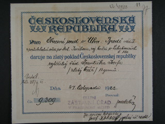 potvrzeni daru na na zlaty poklad Ceskoslovenske republiky ze dne 27. listopadu 1922 na vyznamenani rytirsky rad Frantiska Josefa (ZLATY KRIZ) 13 gramu Au,