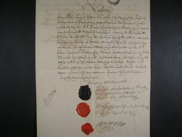Kolky - kvitance z r. 1820 s natistenymi signetami + tri barevne neporusene pecete, dekorativni