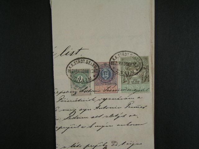 Kolky - dluzni upis s vylepenym kolkem 1kr + 12kr + 2 1/2fl, znehodnoceno ovalnym raz. K.K. STÄDT. DELEG. BEZIRKSGERICHT ZNAIM