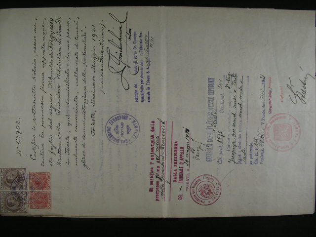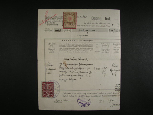 razitko STATNI ZASTAVNI URAD V PRAZE - NOVE MESTO, ruzne podpisy, na zadni strane prezencni razitko Okresniho soudu v Uherskem Brode