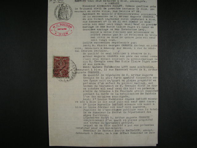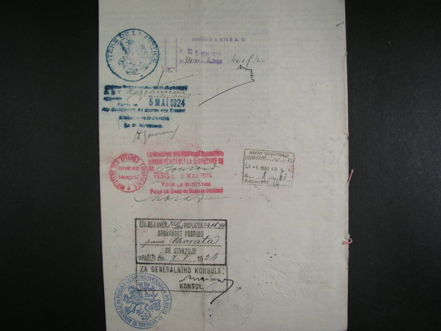 Kolky - uredni listina z r. 1924 s franc. kolkem s ruznymi raz. vc. konzularniho raz. CSR v Parizi