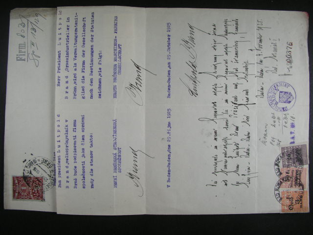 Kolky - uredni listina z r. 1925 se smis. frankaturou kolku CSR - Baden