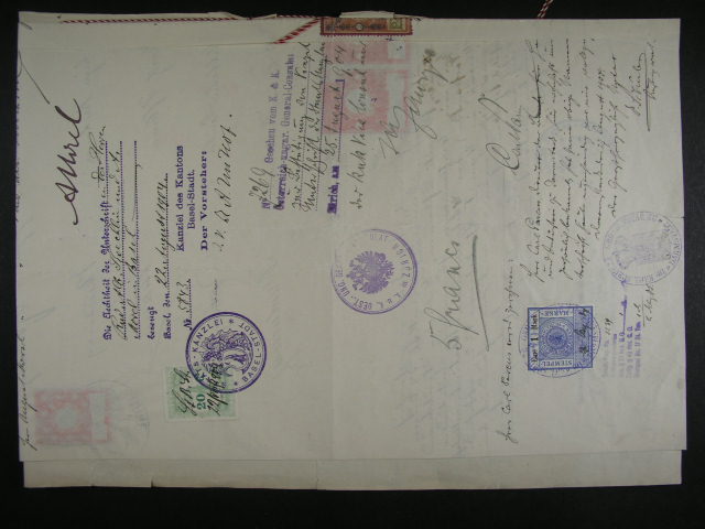 Kolky - dvoulistova uredni listina z r. 1904 se smis. frankaturou kolku Rak.-Uherska, Svycarska a Hessenska + neporusena papirova pecet, dekorativni, zajimave