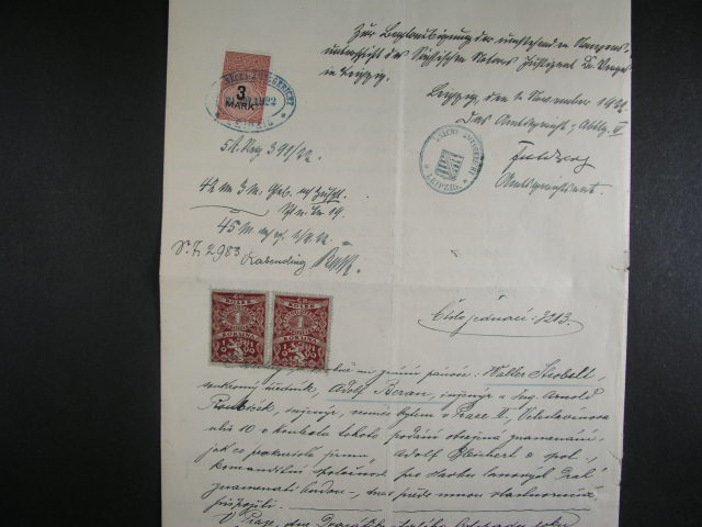 Kolky - uredni listina z r. 1918 se smis. frankaturou kolku Rak.-Uherska + Pruska
